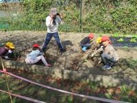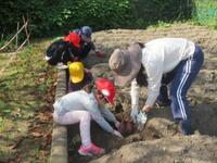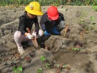 今年は夏の猛暑によりいもの生育がうまくいかず、木陰になる畑に植えられていた苗が育ち、そこのイモを掘りました。思いのほか大きく育っていたサツマイモに1年生は悪戦苦闘。学校主事の先生も手伝ってくださり、やさしくやさしく掘り進めて収穫しました。昨年はお世話しすぎて収穫が少なく、今年は猛暑に勝てませんでした。作物を育てることは本当に難しいです。