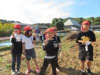 10月24日(火)1・2年生が1学期に植えたサツマイモの収穫を行いました。朝から子供たちは芋掘りの服に着替え、準備万端。その時間をとても楽しみにしていました。