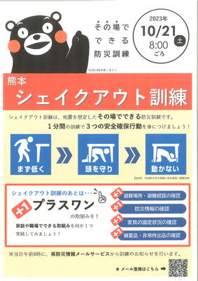 熊本県では、県民の防災意識や自助力の向上を図るため、「熊本シェイクアウト訓練」を実施しています。本年度も地震を想定した訓練と併せ、避難場所・避難経路の確認など「プラスワン」の取組みを実施していただきたいとの依頼がありました。