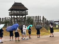 佐賀県の吉野ヶ里歴史公園に到着しました。あいにくの雨の中での見学でしたが,社会科で学習したものがたくさん展示してあり,子供たちも大興奮でした。