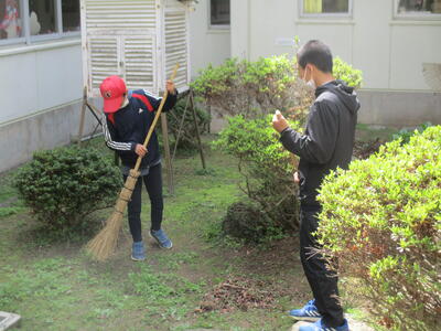 朝から落ち葉はきをしようと中庭に行ってみると、きれいな状態でした。この時期は、桜の花の花柱部分が大量に落ちているのですが、それもほとんど見当たりません。不思議に思っていましたが、朝から5年生の子どもたちがボランティア活動できれいにしてくれていたことを知りました。