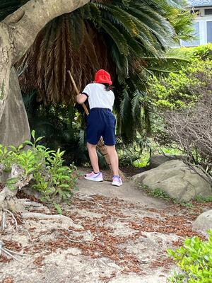 いつものように朝から正門周辺を掃いていると、一人の2年生が竹ぼうきをもって現れました。「校長先生を手伝ってくれるのかな?」と尋ねると、「初めは運動場の草引きをしようと思っていたけど、もじゃもじゃしたのがいっぱい落ちていてたいへんそうだから、こっちをします。」と返してくれました。その後は、一人で黙々と集めてくれました。みんなが集まってボランティア活動をしていたわけでなく、自分で考え、行動する様子を見ながら、たくましさを感じました。また、低学年の子どもたちにも、本校の児童に育てたい資質・能力の一つである「考動力」が身に付いてきていることを感じ、うれしく感じました。