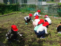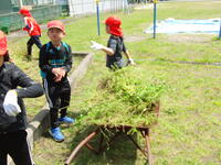 春の陽気で学校の花々が元気に咲き誇っていますが、その分、草もずいぶん伸びてきました。1・2年生が生活科で使う学習園がありますが、その学習園にも雑草がずいぶん生えてきました。本年度も、季節に応じた様々な野菜などを育てるため、1・2年生が力を協わせて草取りをしました。進級した2年生が、1年生に手本を見せようと頑張っている姿を見て、感動しました。今年は何を育て、みんなで収穫を喜び合うのか、今から楽しみです。