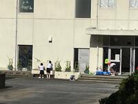 学校の植物のお世話が復活。子供たちは、じょうろいっぱいに水をくんで、花壇や畑の植物に水かけをしていました。