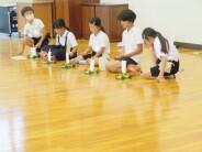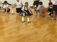 かたや、ホールでは、3年生が理科の学習のまとめをしていました。ゴムと風の力の働きの学習です。うちわであおいだ風と、扇風機の風の強さを比べていました。扇風機は弱風でも車が動いていました。帆の工夫をしながら、できるだけ遠くに車を走らせることができるよう、考えている姿がたくさんありました。