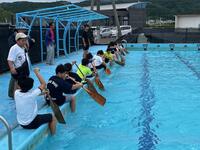 その後、近隣の小学校のプールを使わせていただき、「かい」の使い方や、その練習を行いました。PTA会長様を中心に、保護者の皆さんの協力と指導の下、約1時間みっちり練習しました。