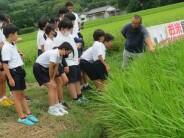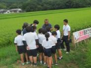 7月16日(火)5・6年生が、5月に田植え体験をさせてた抱いた田んぼの様子を見学に行きました。5月もお世話になった農林水産課の方とJAの方も来てくださり、田植え後、稲がどのような成長をしてきたのか、その間にどんな作業があったのかを説明してくださいました。