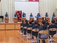 まず、天領太鼓の披露がありました。坂小の先輩もメンバーに入っており、力強い太鼓の音を聞かせてくれました。太鼓部に入ってみたいと思った子もいたようです。