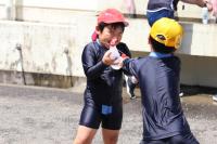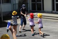 1年生の生活科「なつとあそぼう」で、1年生の子どもたちが自宅からもってきた容器等を水でっぽうにして楽しんでいました。ちょうど校長室から見える場所で行われていたので、子どもたちの楽しそうな表情を写真に撮ってみました。お互いに水をかけ合う子もいれば、自分の頭に水をかける子もいて、本当に楽しそうでした。