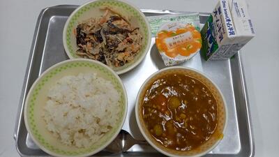 NEW 12月24日(水)ぷち丸ごはん、ビーフカレー、ごぼうサラダ、みかんのジュレ、牛乳