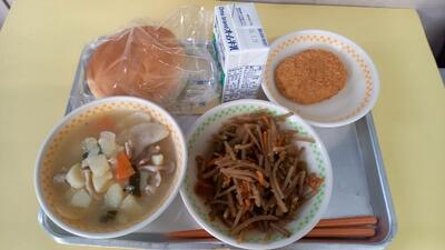 NEW 1月13日(火)横割り丸パン、ラビオリスープ、かぼちゃコロッケ、きんぴらバーガーの具、スライスチーズ、牛乳