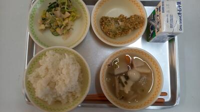 NEW 1月19日(月)ごはん、白玉だんご汁、ホキの天玉あげ、れんこんサラダ、牛乳