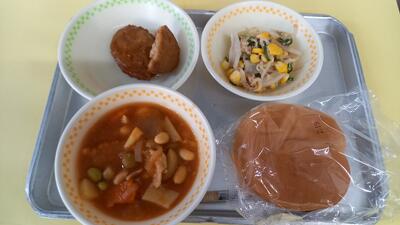NEW 2月20日(金)横割り丸パン、ポークビーンズ、チキン照り焼きパティ、こんにゃくサラダ、牛乳