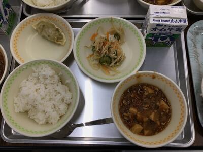 NEW 3月13日(金)麦ごはん、ぎょうざ、バンバンジーサラダ、マーボー豆腐、牛乳