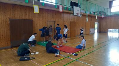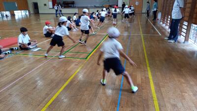 今日はスポーツテストを行う予定でしたが、雨のため、ペア学年ごと(1・6年生、2・5年生、3・4年生)に体育館でできる種目のみ(反復横跳び、上体起こし)行いました。