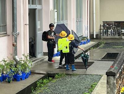 今朝は、天気予報どおり雨模様でした。子供たちは、雨具を着用したり、傘をさしたりして元気に登校してきました。写真は、校舎に入る昇降口前の様子ですが、みんなひと手間かけて中に入っていました。