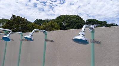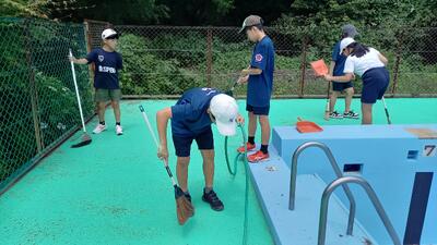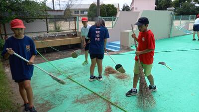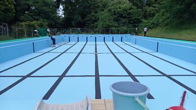 6月6日5時間目にプール掃除がありました。本年度は、プールが新しく改修されたため、外回りの掃き掃除のみ、6年生で行いました。プールの底は美しい水色、プール回りはグリーンで塗装され、触っても熱くならないように特殊塗料で塗ってあるそうです。