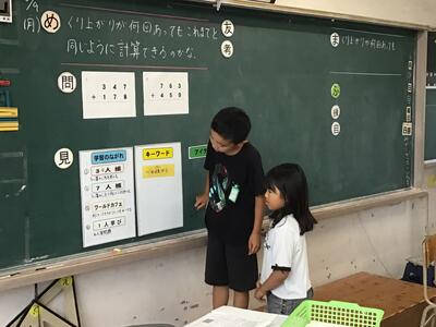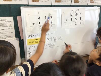 9日(月)5校時に、3年1組で研究授業がありました。位の大きい数同士の筆算の授業です。学習リーダーさんが前に出て、学習のめあての確認、学習の流れ(見通し)、キーワード、学習で使うアイテムの確認を行います。子供たちは、自分たちで学習を進め、素晴らしいです!