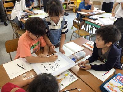 この時間は、新出漢字の学習だったようで、学習リーダーが黒板に書いてある漢字をなぞりながら、他の子供たちは一緒に画数を数えていました。