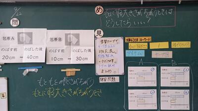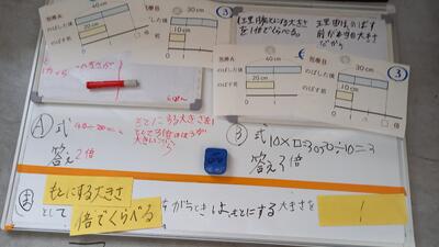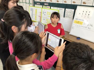 他グループの考えを聞くときには、タブレットでホワイトボードを写真で撮り、自分の班に持ち帰ってさらに考え方を比較していました。子供たちに学び方がしっかり身についており、担任の先生の指示や説明がほとんどありません。(担任の黒田先生は、子供たちの考えをつなぐ声掛けを随時しており、さりげなく、子供たちをサポートしていました。)3年生のみなさん、他学年のお手本となる素晴らしい学び方でした!