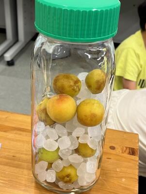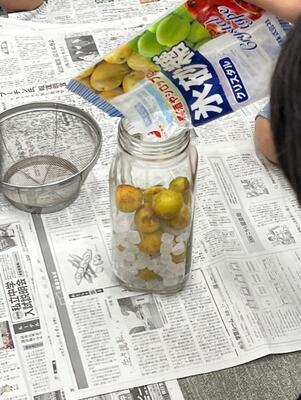 広口のビンに旬の梅の実と氷砂糖を交互に入れて…