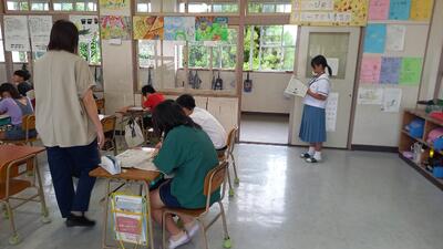 6月から1年生は席替えし、これまでのコの字の席から、2列ずつの席に代わっています。1年生においても、少しずつペアやグループでの学習を取り入れ、教師が一つずつ指示を出すのではなく、自分たちで主体的に学習できるように学び方を教えているところです。