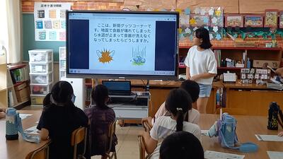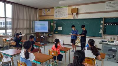 環境委員会の発表では、校内のごみ集めの活動や環境に関するクイズが出題されました。今度スタンプラリーを行うという発表に、子供たちも喜んでいました。