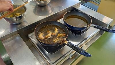 荒尾市給食センターには、大きな釜で具材を混ぜる体験コーナーがあります。実際に試してみると、大変な作業ですね。自分たちの給食がどのようにして作られるのか知ることができました。安全でおいしい給食を作ってくださる給食センターの皆様に感謝の気持ちをもって、給食をいただきたいと思います。