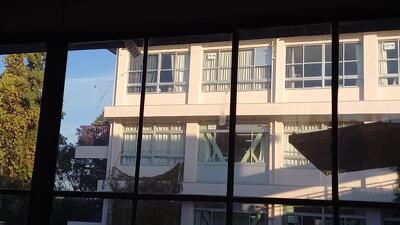 3年生の教室の窓から、準備OKの合図をおくる子供たち。