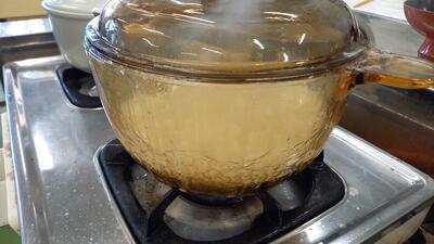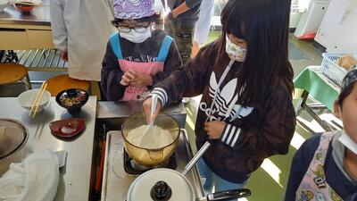 米を透明の鍋でたき、炊きあがっていく様子を観察しました。味噌汁は、いりこで出しをとり、大根などを入れて調理しました。