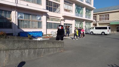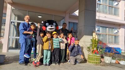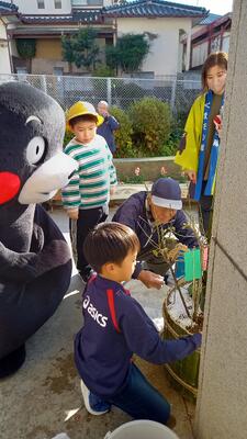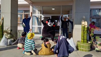 放課後子ども教室「シエスタ」に桜山げんきかいの皆様をゲストにお招きし、門松づくりを行いました。そこに、本日のスペシャルゲストとして、くまモンがやってきました。