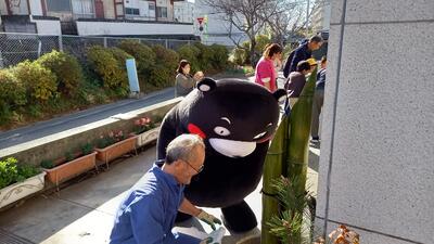 職員玄関の両隣に立派な門松ができました。くまモンにも手伝ってもらいました。