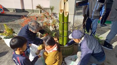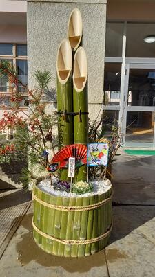 立派な門松ができました。協力いただいた桜山げんきかいの皆様、シエスタの皆様、くまモン隊の皆様、ありがとうございました。大切に飾らせていただきます。保護者、地域の皆様、ぜひみに来てください。