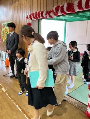 式の後は、全校児童で作ったアーチをくぐりながら退場していただきました