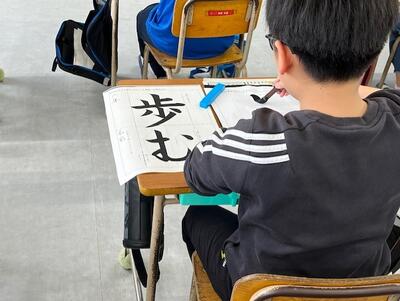 6年生の教室では、本年度最初の習字の授業が行われていました。テーマは「歩む」
