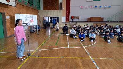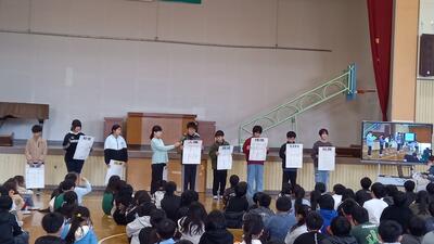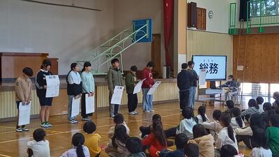 2月17日(火)に児童集会が行われ、各委員長から今年取り組んできたことや、成果と課題について発表がありました。