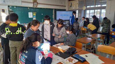 校舎のあちこちにクイズが張って貼り、子供たちはクイズ問題を探し、一生懸命回答していました。