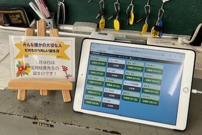 職員の出退勤は、職員室入口に設置してあるタブレット上で行います。毎日職員の目に留まる場所なのですが、職員の誕生日にはお祝いのメッセージカードが飾られます。教頭先生が、カードを作成してくださり、それを見た本人はもちろん、他の職員も自然と「お誕生日おめでとうございます」と当該職員に声をかけるのです。ちょっとした心遣いが、職員室の温かい空気を創り出しています。1年に1回必ず訪れる記念日…ありがたいです!