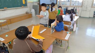 1年生 おすすめの本紹介 好きな本の題名や好きな理由を紹介し合いました。