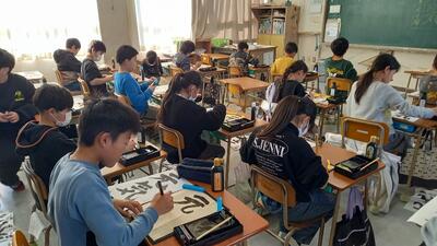 4年生は、習字に取り組んでいました。誰一人声を出さず、集中して字を書いていました。