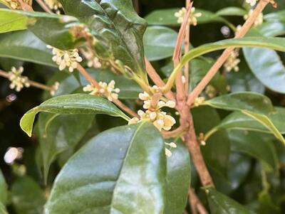 南校舎と北校舎をつなぐ渡り廊下を歩いていると、かすかにいい香りがしてきます。ちょうど中央付近に植えてあるモクセイが花を咲かせていたのです。どうやら花の色が白っぽいので、「ギンモクセイ」のようです。(オレンジ色の花は「キンモクセイ」なので)