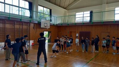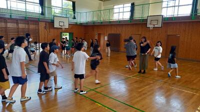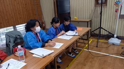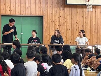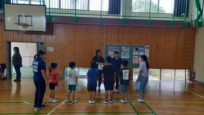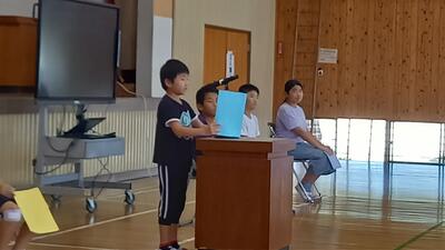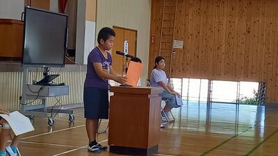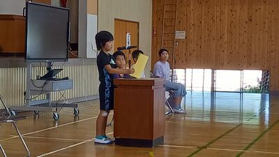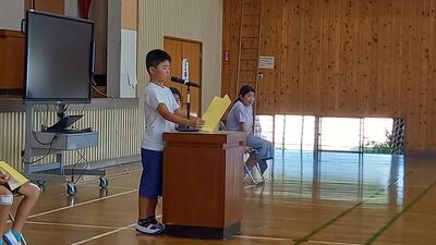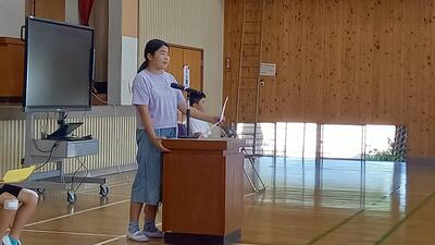 また、同じ体育館のステージ側では、前期終業式の代表児童のスピーチの練習が行われていました。