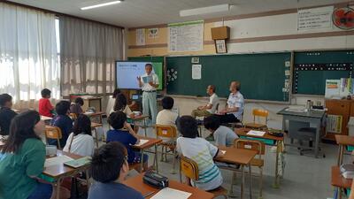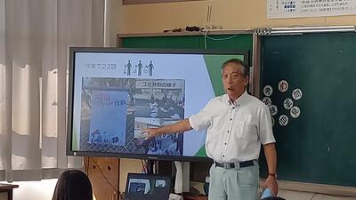 10月2日の3時間目に、地区協議会会長 吉村さん、桜山げんきかい会長 久能さん、事務局長 満平さんを5年生教室に招待し、桜山クリーン作戦の事前打ち合わせをしていただきました。吉村さんから、桜山クリーン作戦の歴史、趣旨や、大谷翔平選手が、最高のパフォーマンスを発揮するために、ごみ拾いを重視していること等を話していただきました。真剣に話を聞いている子供たちが印象的でした。