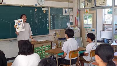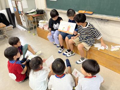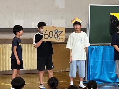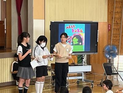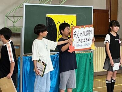 図書委員会の発表では、読書月間のお知らせと、絵本「へんしんトンネル」の読み聞かせがありました。声の抑揚や登場人物になりきった声色など、いろいろな工夫があり、お話を聞いていた子どもたちからは、「感動した」「すこし涙が出そうになった」など好評でした。