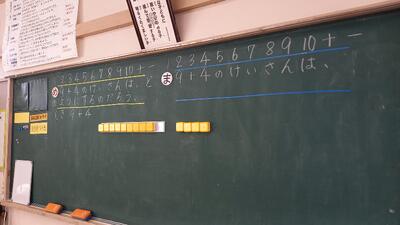 1年生の教室では、繰り上がりのある足し算に挑戦していました。