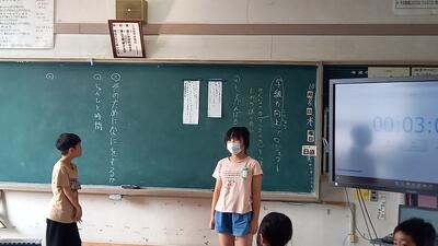 3年生の教室では、学級力向上プロジェクトの振り返りをしていました。学級力向上プロジェクトとは本年度から始めた取組みで、学級の頑張り度合いを子どもたちが自己評価し、課題を自分ごととして共有し、課題改善に向けた取組みをみんなで行うものです。3年生のクラスがもっともっとよくなるように、しっかり話し合っている様子が見られました。