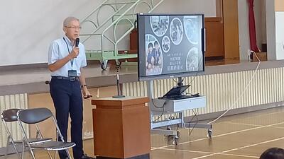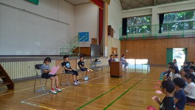 次に、校長先生から前期の子供たちの頑張りについて話がありました。本年度は、3つの力(主体的に動く力、継続する力、関わる力)が身に付くように子供たちに意識させてきました。主体的に動く力として、自主的に落ち葉集めやごみ拾いをしてくれた人の話、継続する力として、雨の日に傘をきちんと丸めて直し続けていること、関わる力として、授業中に学び合う姿が多く見られたこと等、子供たちの頑張ってきたことの紹介がありました。