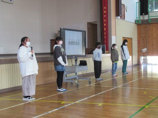 たくさんの子どもたちの頑張りが見られ、うれしく思います。続いて保健委員会からの発表でした。毎週のさわやか調べの結果や保健室の利用状況等をクイズ形式で紹介してくれました。