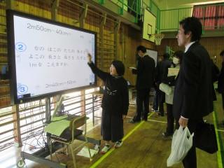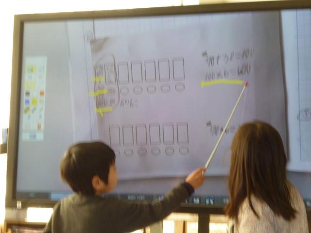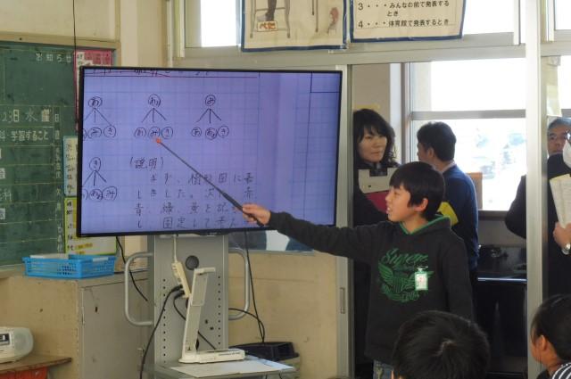 公開授業の様子。電子黒板にノートを映して説明しています。