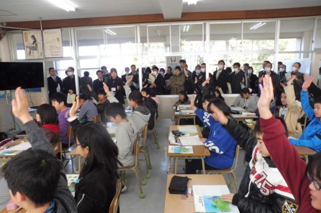 公開授業の様子。手を挙げて意欲的に参加しています。
